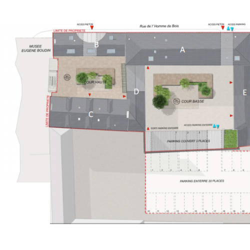 Un parking accueillant 20 places de stationnement sera créé dans le sous-sol de la parcelle voisine. L’accès se fera directement depuis la rue de l’Homme de Bois. Un préau sera placé le long de la banquette (cour basse) garantissant l’affectation de 3 places de stationnement supplémentaires.
