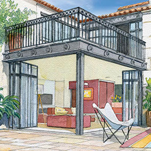 Le bâtiment en fond de parcelle, aura lui aussi ce caractère plus moderne. Cette façade vitrée permettra de jouir d’une façon permanente de la beauté de ce jardin qui sera rafraîchi et agrémenté d’une piscine.